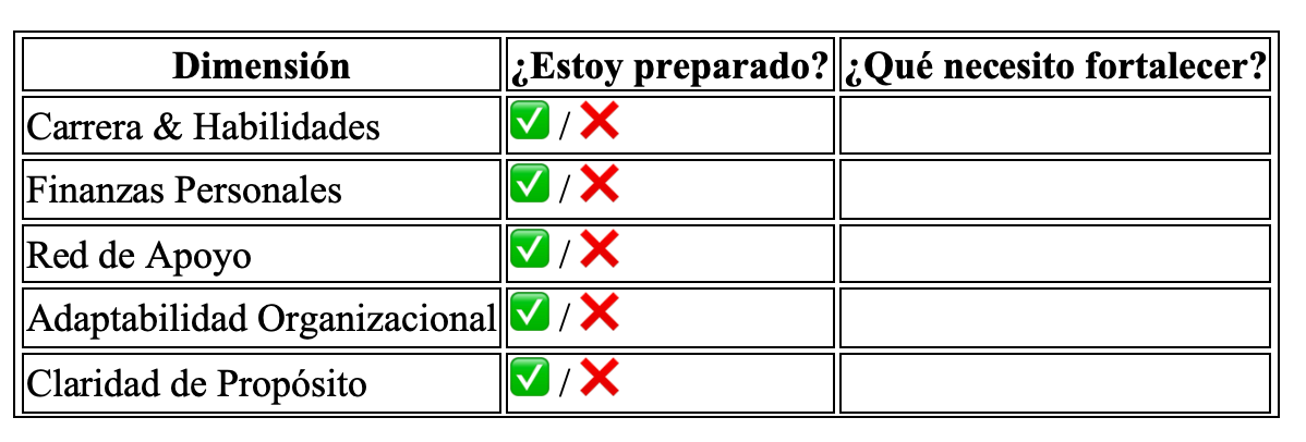 Apóyate en esta tabla, y con tu equipo, tu pareja o tu solo, analiza cada una de las dimensiones. No aspires a planes perfectos, pero sí a reflexiones profundas sobre tu presente y futuro. Comparte tus perspectivas y posibles decisiones y valida con otros qué tan plausibles son. (Quizás encuentres puntos ciegos). Y si bien puede que este ejercicio te regale algo de dirección, recuerda que todo esta cambiando rápidamente. Tendremos que revisar y actualizar nuestro enfoque con relativa frecuencia.