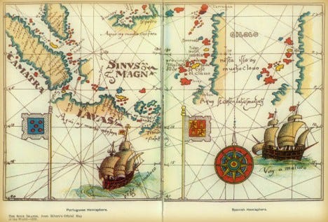 Los buenos estudiantes de historia y sobre todo mis colegas de RRII recordamos el Tratado de Tordesillas en 1494, a través del cual España y Portugal se repartieron el mundo conocido con una línea imaginaria. Cuando España comenzó a declinar en el siglo XVII, sus intentos por mantener el control aceleraron su caída.
