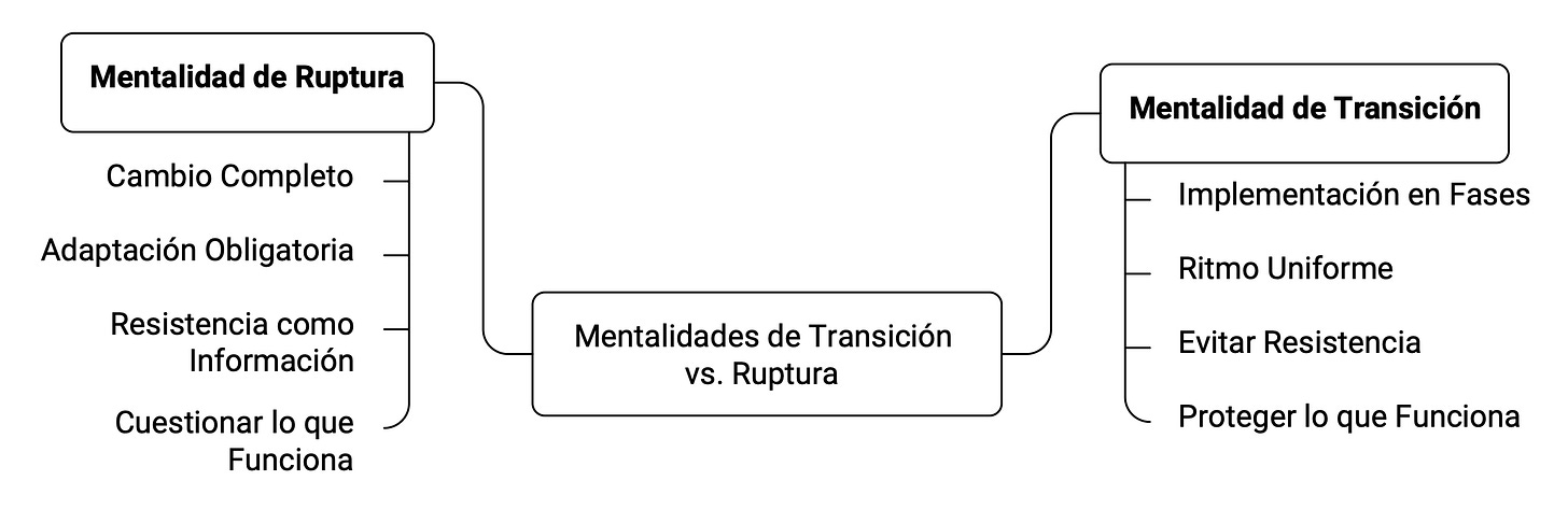 Las rupturas requieren compromiso total. No puedes tener un pie en el futuro y otro en el pasado. Genera disonancia cognitiva y paraliza. En nuestra experiencia con “Gestión del Cambio”, los líderes más exitosos no le temen al “costo hundido”. “Dejamos atrás nuestro CRM y nos enfocamos en el nuevo. Punto”.
