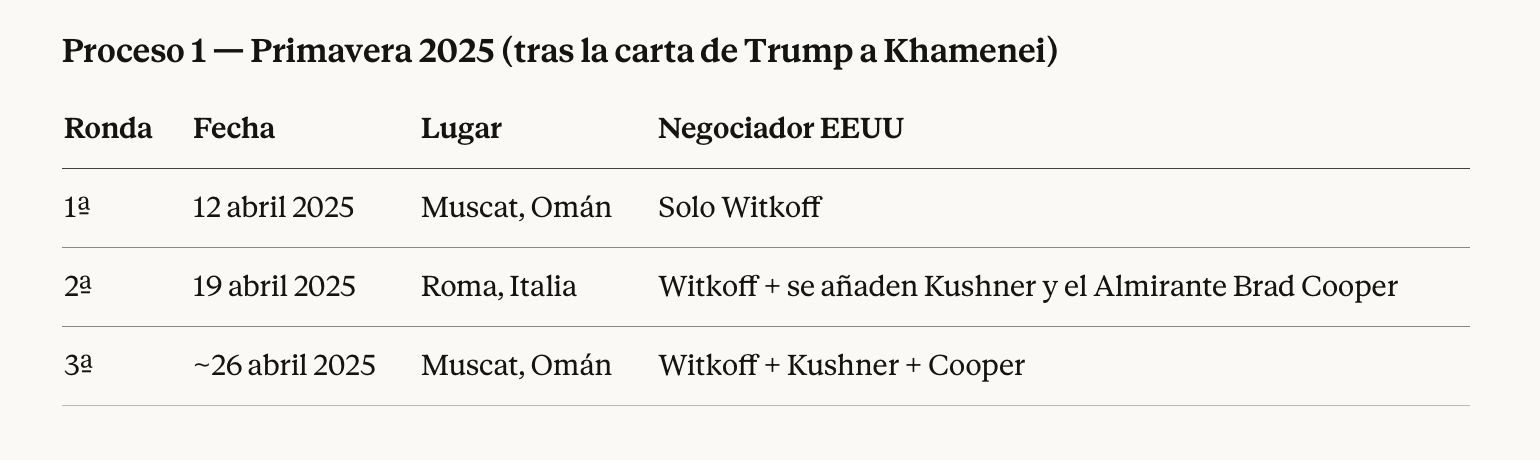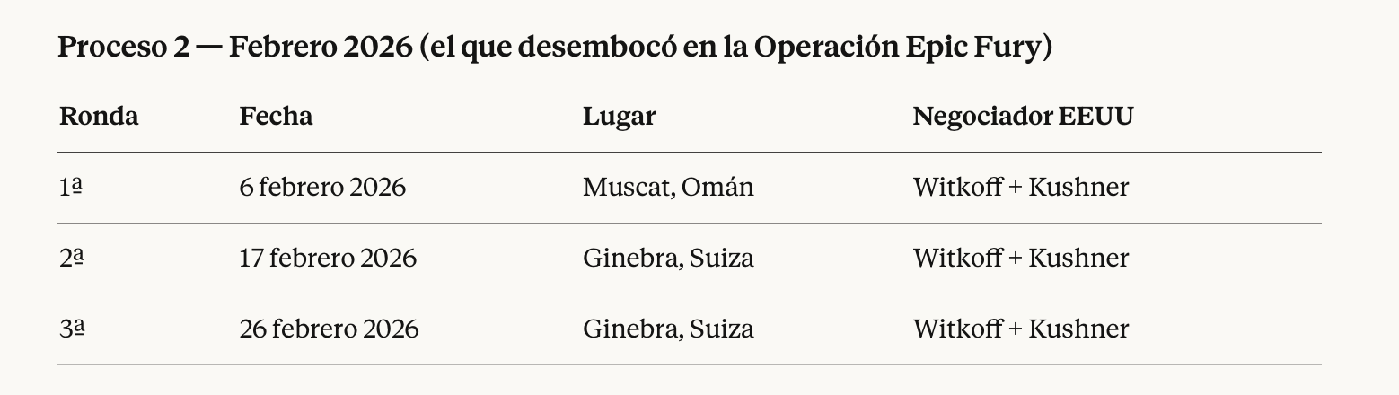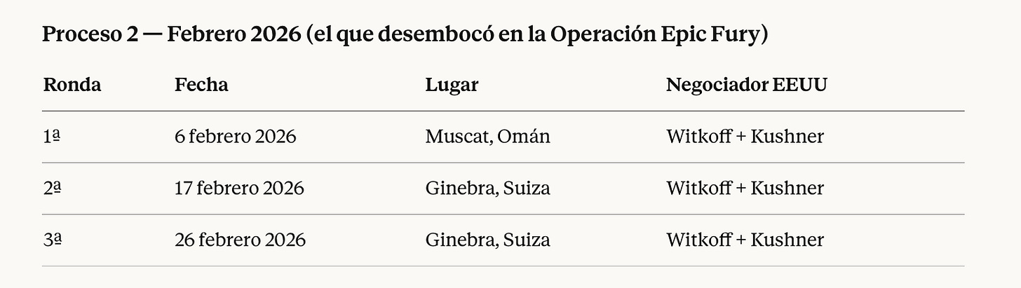 Luego, el segundo proceso, tuvo lugar en febrero de este año, con tres negociaciones, todas mediadas por el canciller omaní Badr al-Busaidi en Muscat y Ginebra. Por el lado estadounidense, las sesiones fueron lideradas por el enviado especial Steve Witkoff y Jared Kushner, yerno de Trump, sin cargo oficial en el gobierno. No participa el Departamento de Estado.